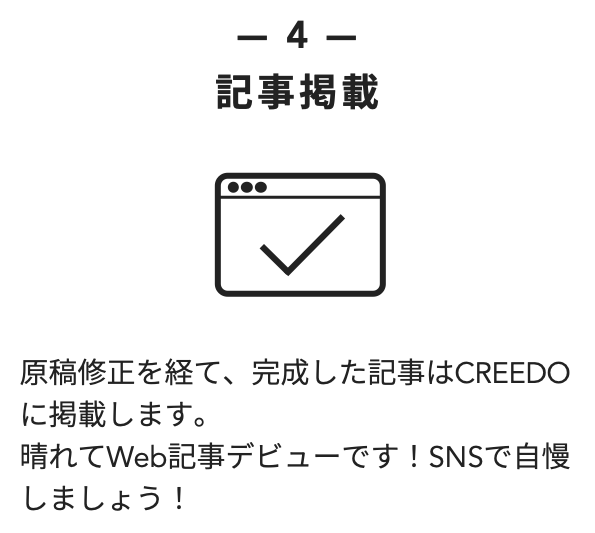 そう、それはあなたです。CREEDOの最大の特徴は、インタビュー記事の語り手を公募すること。応募いただいた方の志や仕事哲学を丁寧にインタビューし、素敵な記事に仕上げて掲載します。あなたの等身大の想いが読者の心に火を灯すのです。