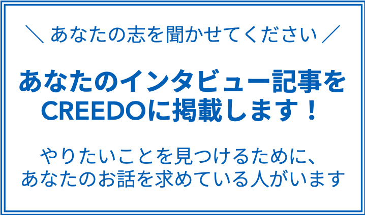 CREEDOは、自分と近い属性・職種・境遇の語り手の志や仕事哲学に触れることで、自分のやりたいことを定めるヒントが見つかるインタビューメディアです。言ってみればそれは、大人のバーチャルOB訪問。