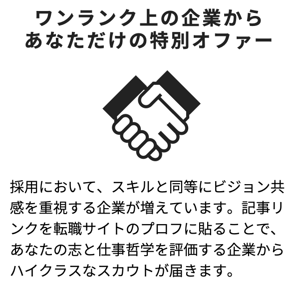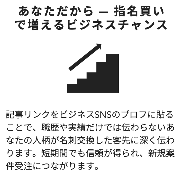 仕上がった記事は、ご自身のSNSや転職サイトのプロフィール欄に貼りつけることで、ビジネスチャンスの拡大やキャリアアップのためのパーソナルブランディングとしてご活用いただけます。