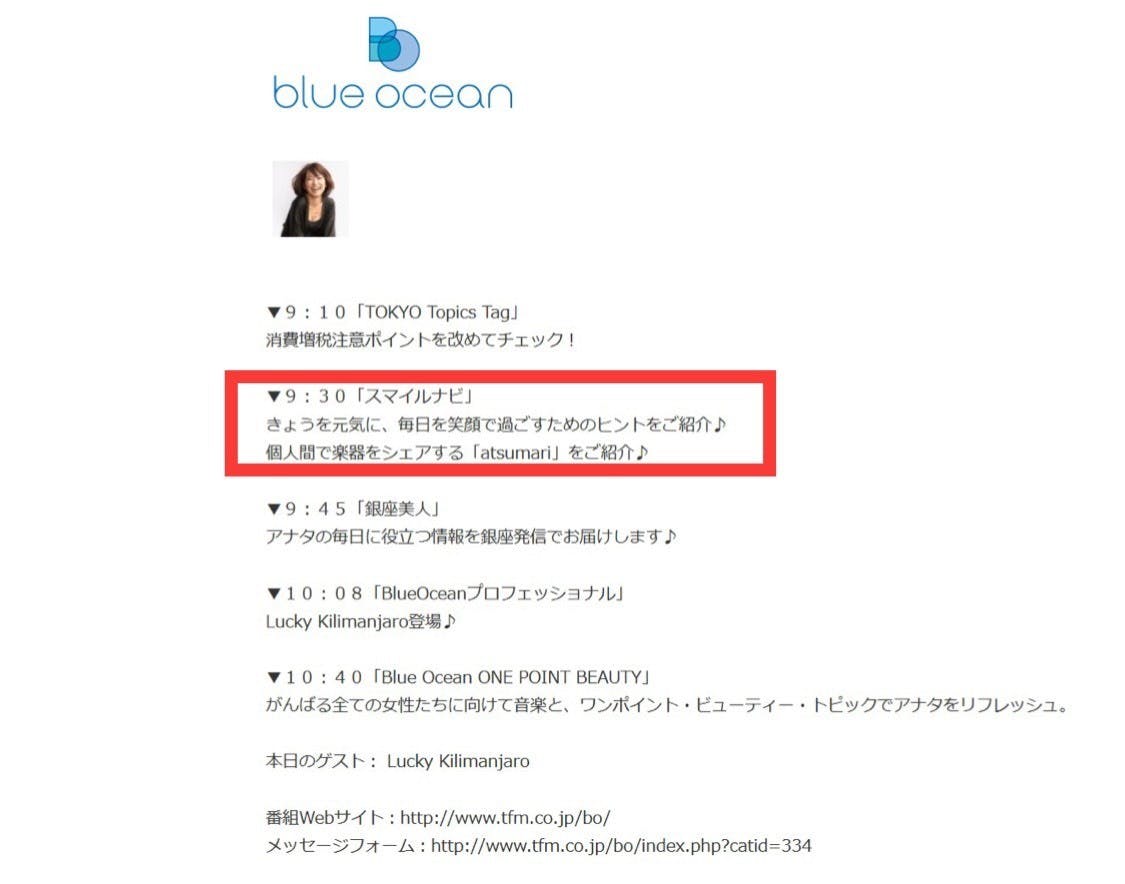2019/10/04 17:03先日10月1日に、ラジオ TOKYO FMの「BLUE OCEAN」のコーナー「スマイルナビ」にて紹介して頂きました! もっと見る