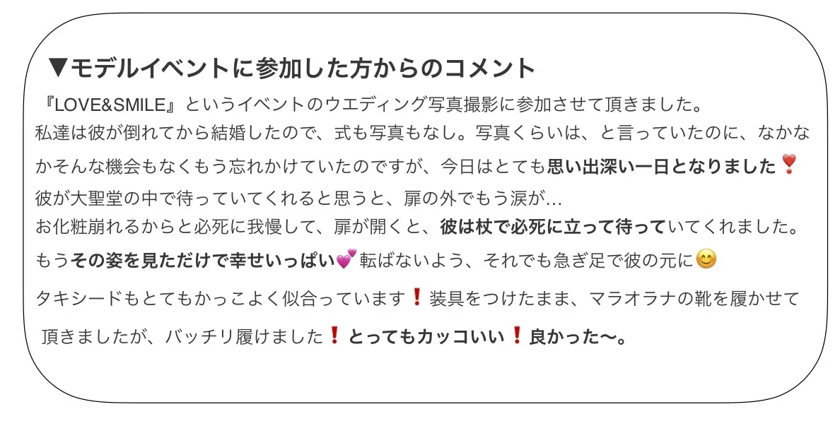 そして2019年7月、式典や結婚式、正式な場にはく靴が欲しいとの声にお応えしてセレモニー用のシューズを開発。その靴をはいていただき、ウェディングフォトを当事者ご夫婦にプレゼントするイベントを青山のセントグレース大聖堂で行いました。