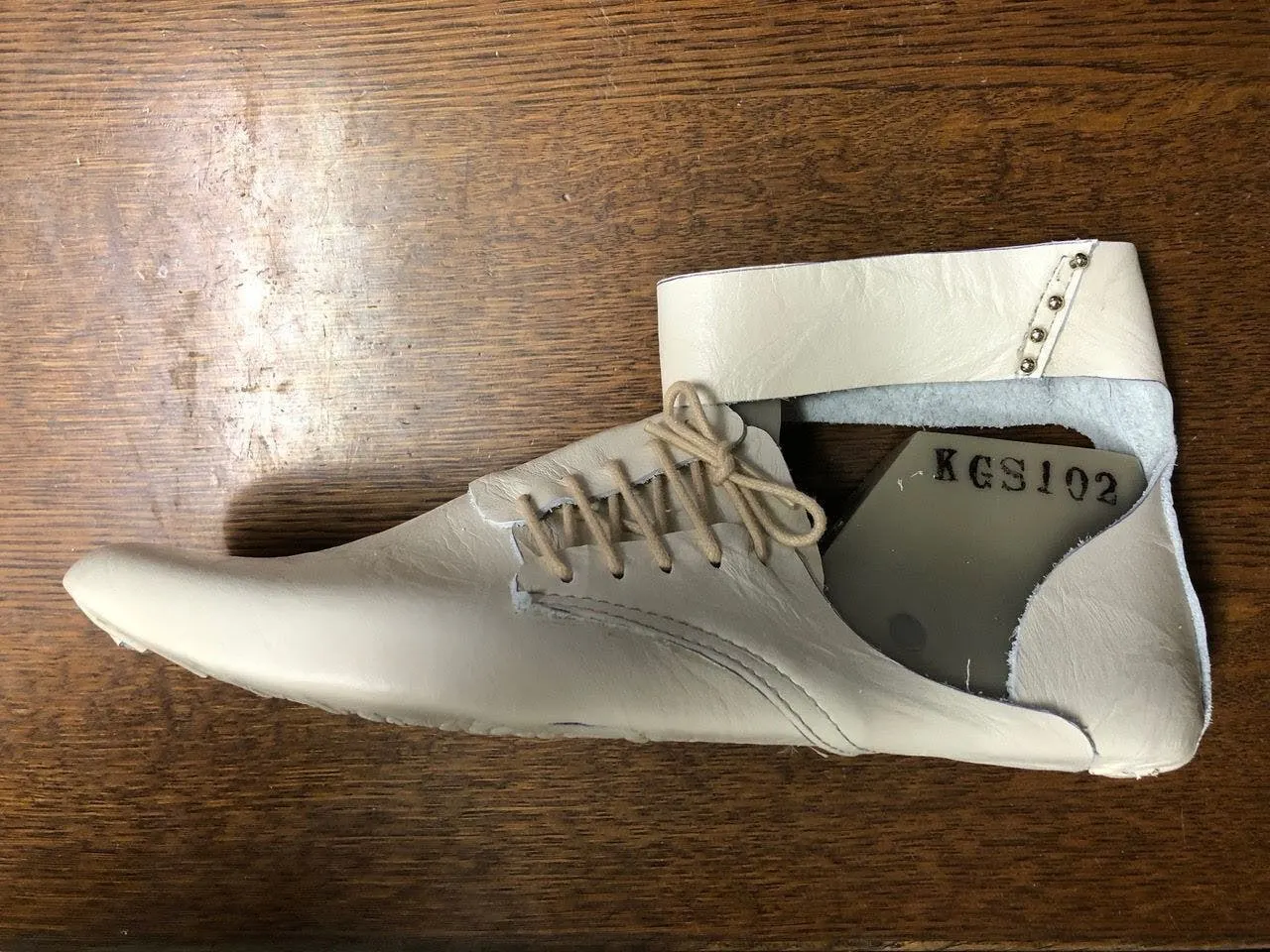 下肢装具に合わせて木型から作りました。サイズを増やしていきます。