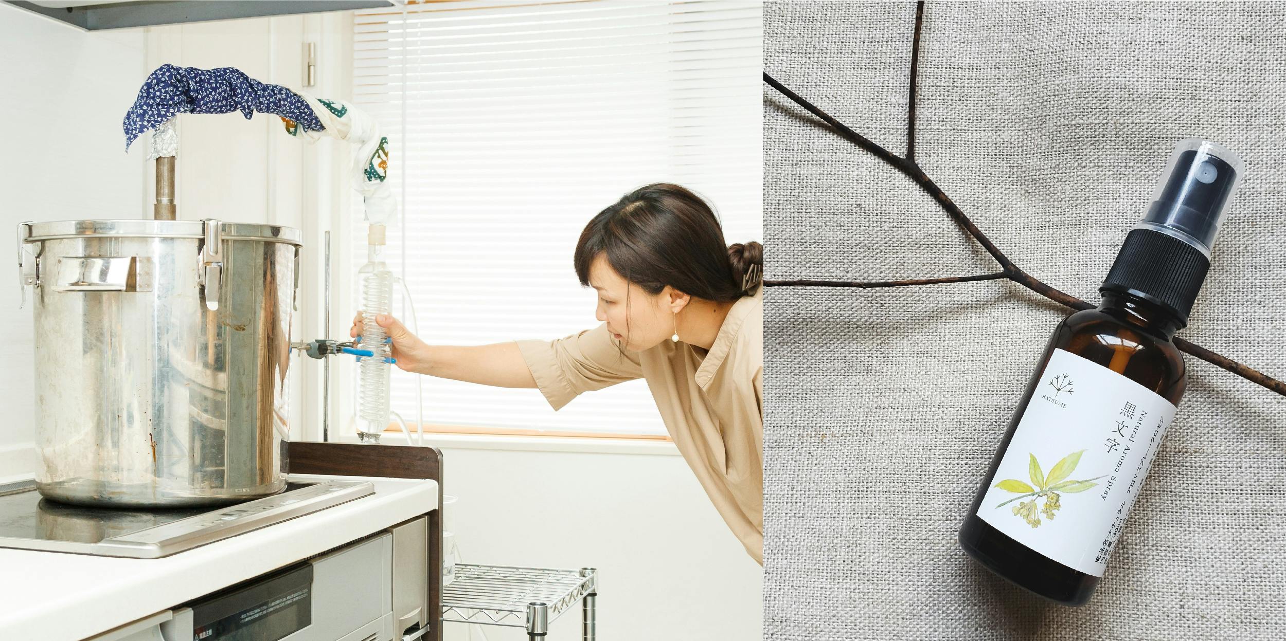 蒸留器に黒文字をセットし、蒸留で得られた精油と芳香水をお持ち帰りいただけます。