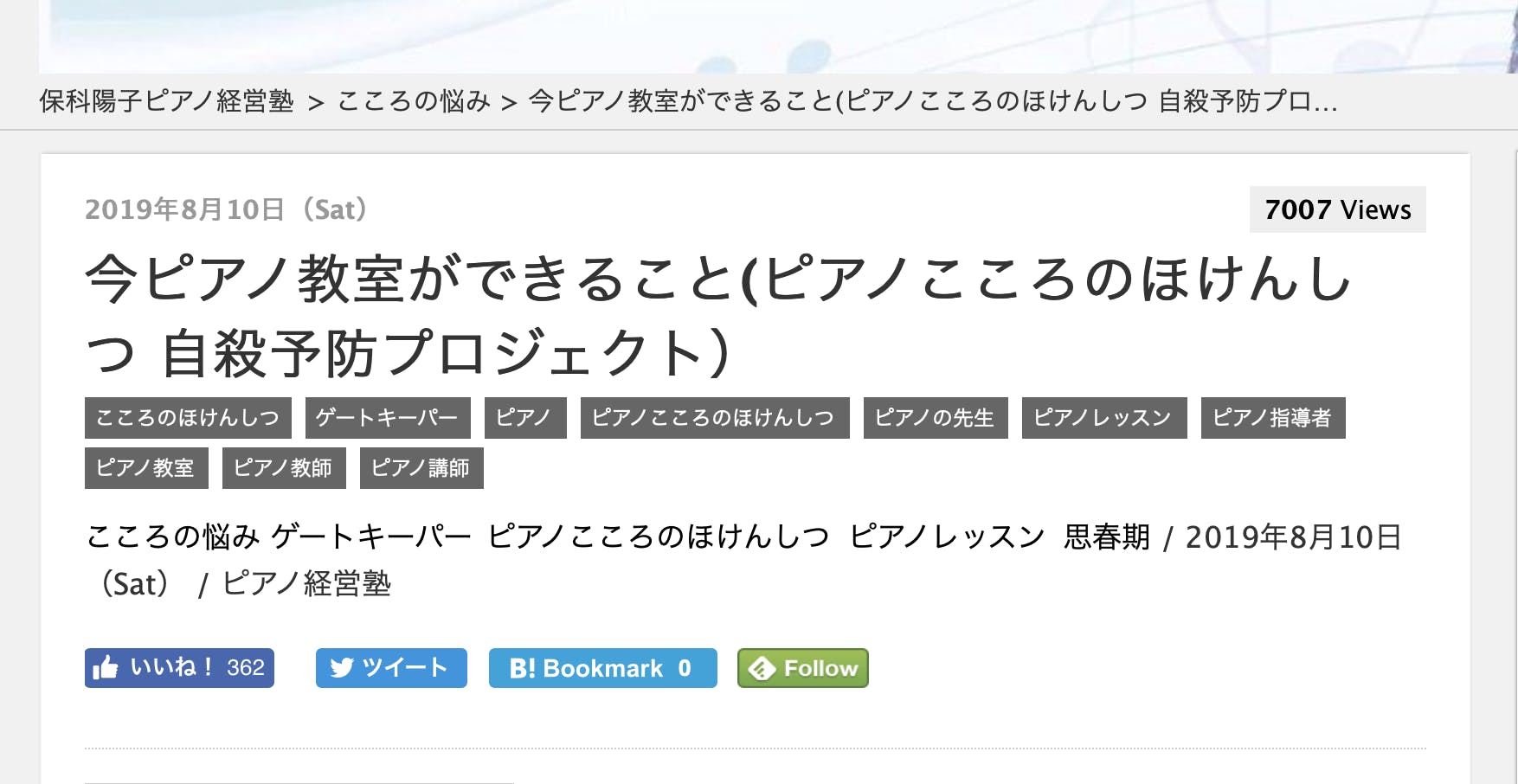 2019/09/13 20:31「死にたいくらいに辛い」「孤独を感じている」「いじめられている」「身近な人に打ち明けづらい」そんな子どもたちを助けたいピアノ教室ゲートキーパー宣言。自殺防止・注意喚起になればと書いた記事が7000PVになりました。http://coachinglesson.com/piano/piano/kokoro/ もっと見る
