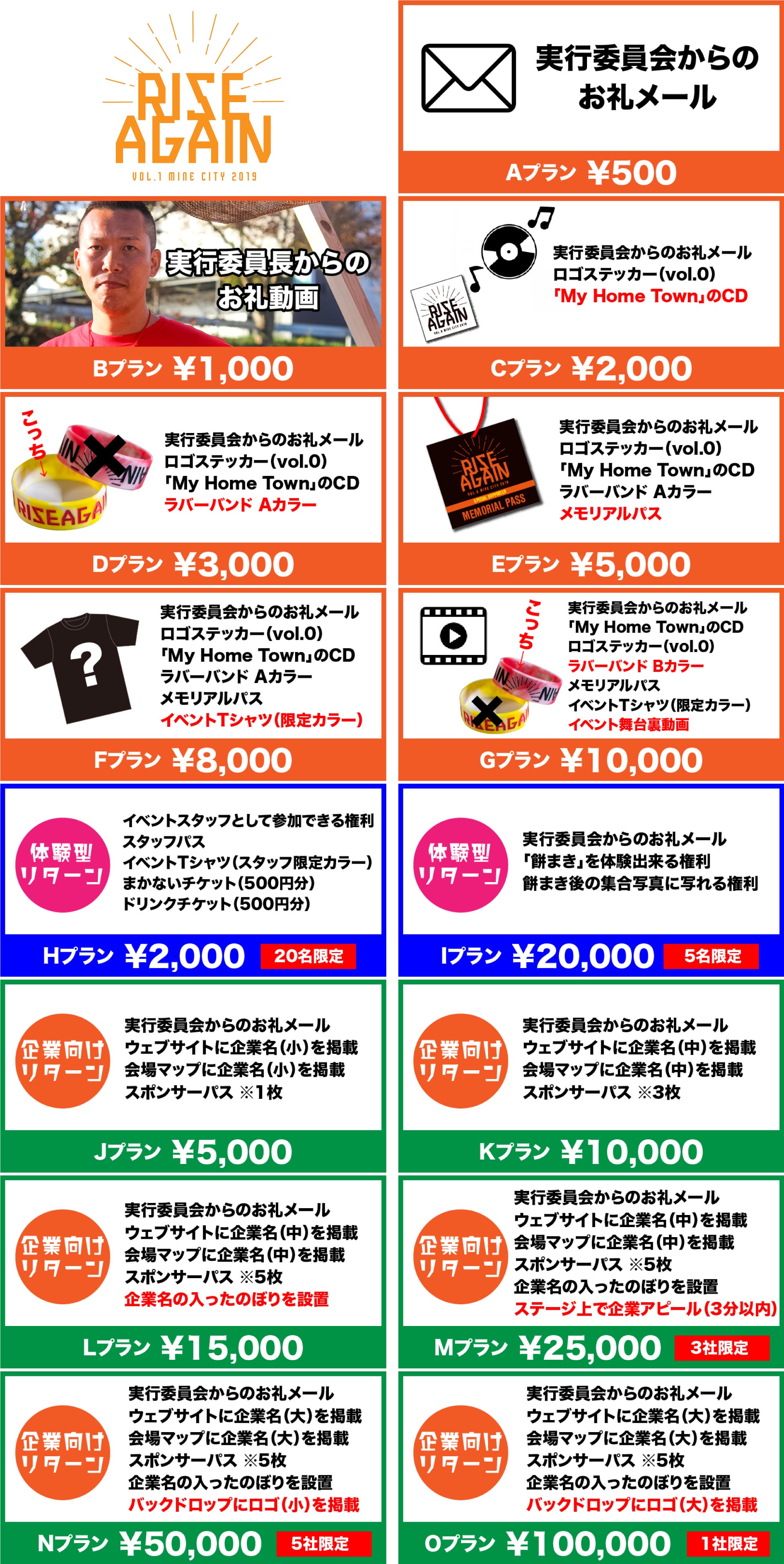 個人向け・体験型・企業向けのリターンをご用意しました。
