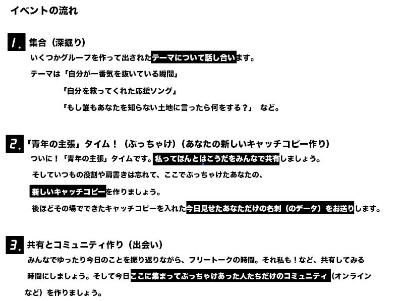 この場では思いっきり、いつもは隠している自分をぶっちゃけて欲しい。そしてそれを、もうすでに知り合っている、仲良くなっている仲間にこそ、聞いて欲しい。よく知ってるはずのその仲間の、まだ見えていなかった部分を見つけて欲しい。