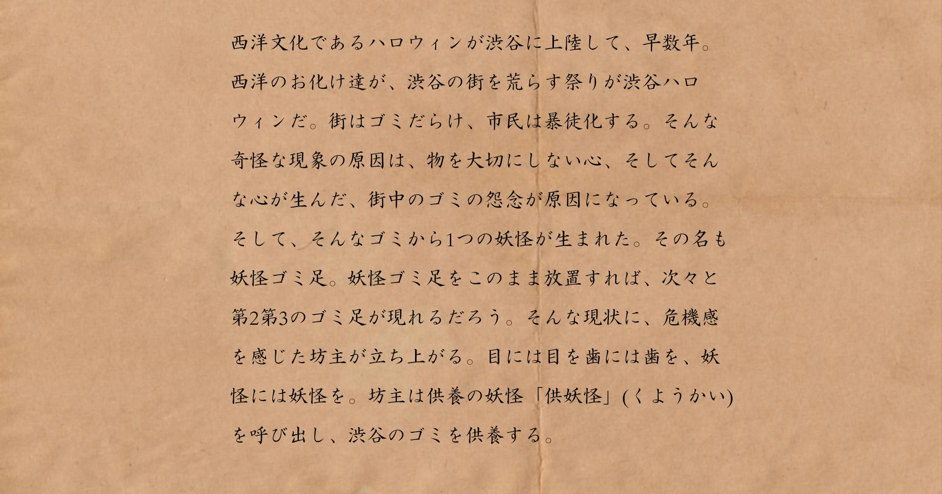 そこで渋谷ハロウィン翌日の早朝に、ゴミを集め供養するというパフォーマンスを本物のお坊さんとオリジナルの妖怪で行うことで、忘れ去られた、物を大切にするという心をくすぐることでゴミ問題に一石を投じます。