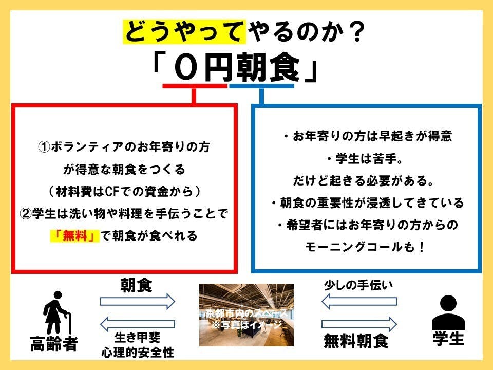 「0円朝食プロジェクト」と題し、お互いにとってハードルが低い「朝食」という形を通して学生とお年寄りを繋げるプロジェクトで、イベント形式で行います。参加可能なのは、原則お年寄りと学生のみで、朝食招待券を持つ人は特別に参加可能です。