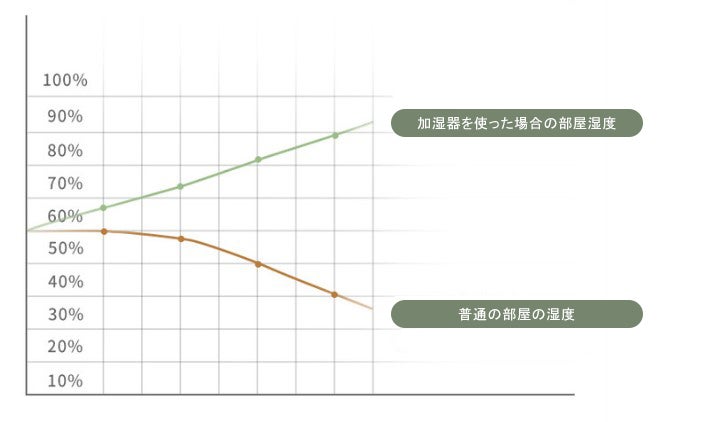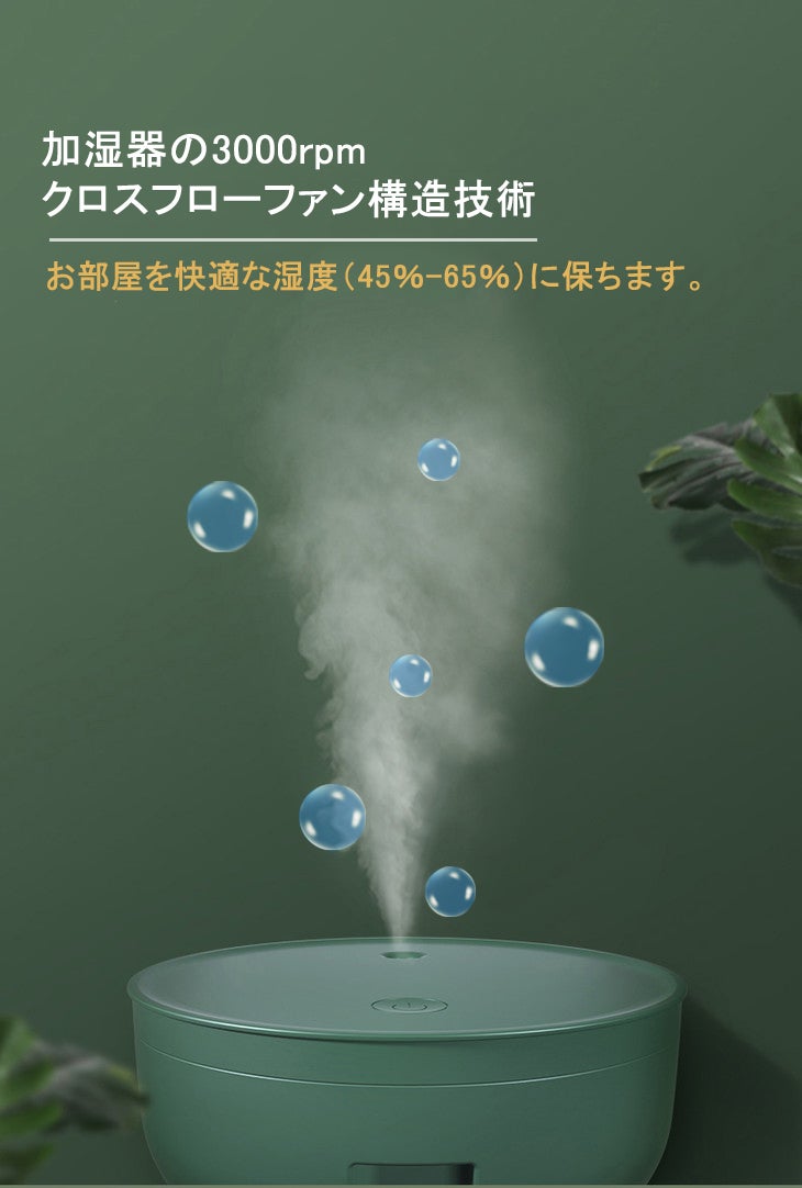 加湿器の3000rpmクロスフローファン構造技術により、水が1-5umの粒子にされて放出し、扇風機の風で室内に運ばれるので、お部屋を快適な湿度(45%-65%)に保ちます。