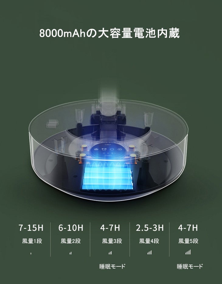 8000mAhの大容量電池内蔵で、コンセントに繋がなくても、枕元やキッチンや屋外でもどこでも使えます。