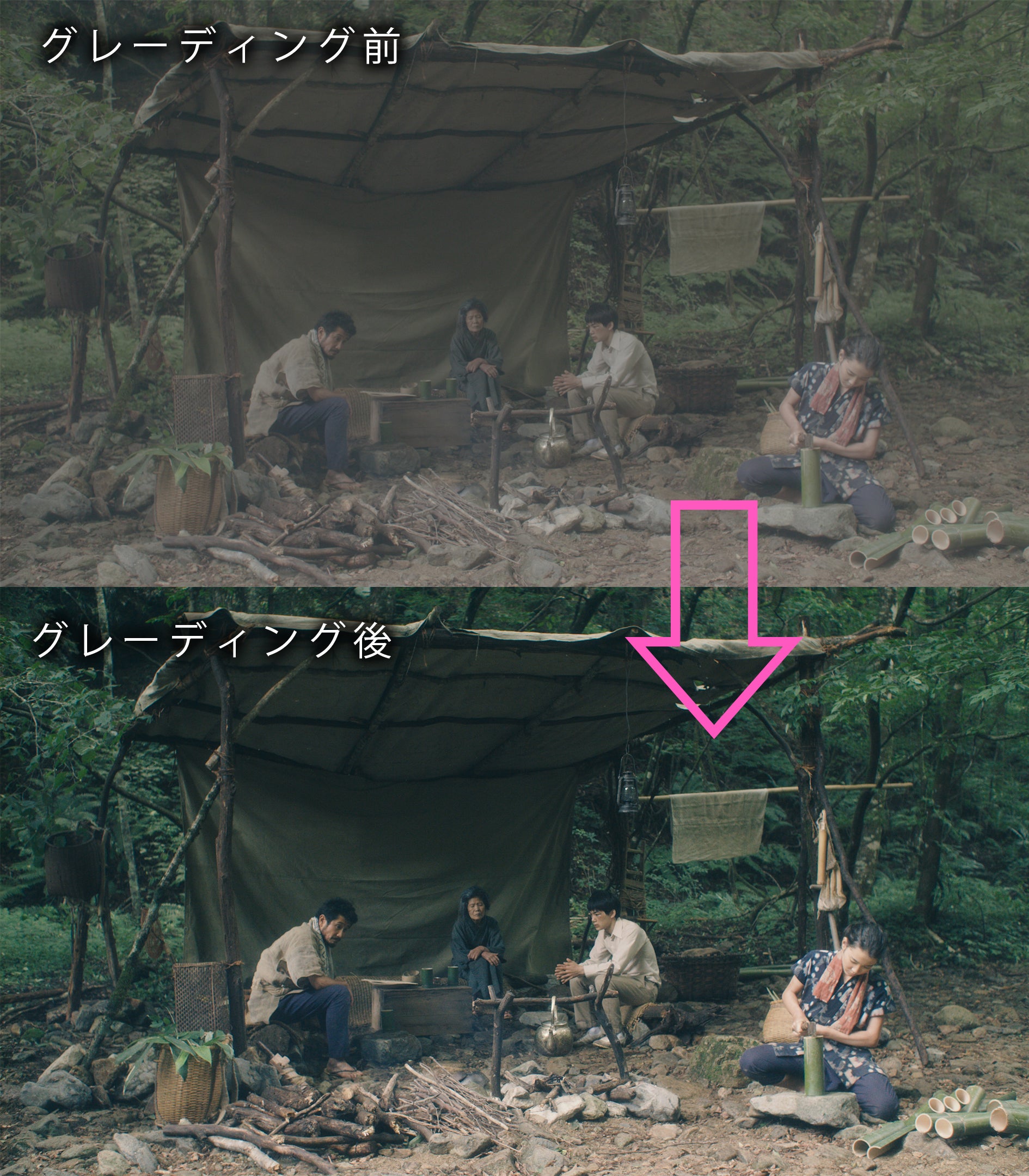 下記のように、グレーディングをかける前、かけた後とは映像が大きく異なります。様々な作品を手がけてきたカラリストがワンカットずつ丁寧に色を調整していきます。