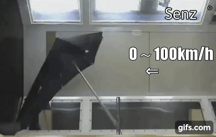 【風洞実験:右方向からの強風に裏返る従来の傘】