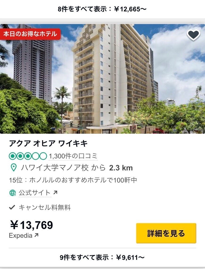 ・ハワイ研修場所近くのホテルに宿泊(3泊4日): 約6万円
