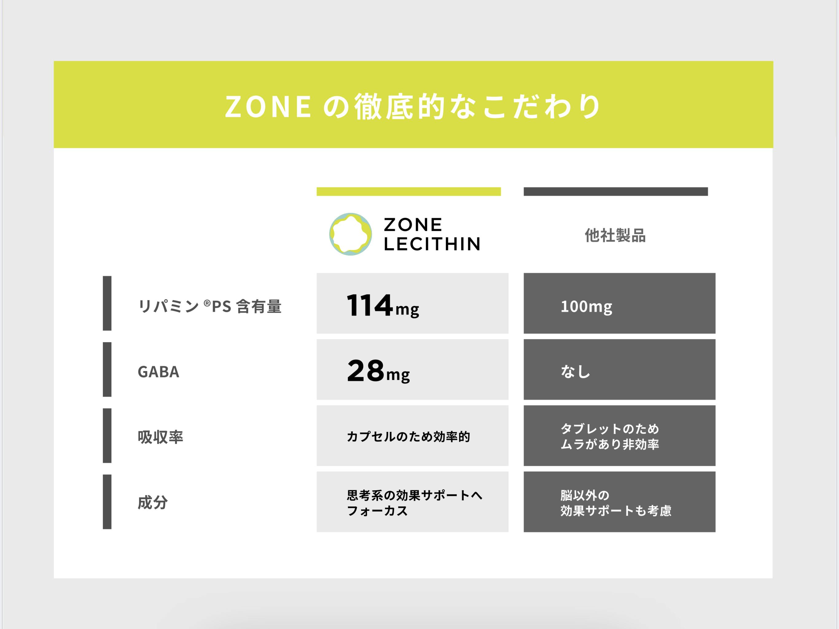 他社製品と比較してZONE LECITHINはリパミン・GABA含有量が優れていることに加え、吸収率もより効率的である試験結果が出ています。また他社製品は、睡眠促進効果サポートなど、思考以外の効果にもフォーカスしているのに対し、ZONE LECITHINは思考・集中に特化したサプリメントとなっています。
