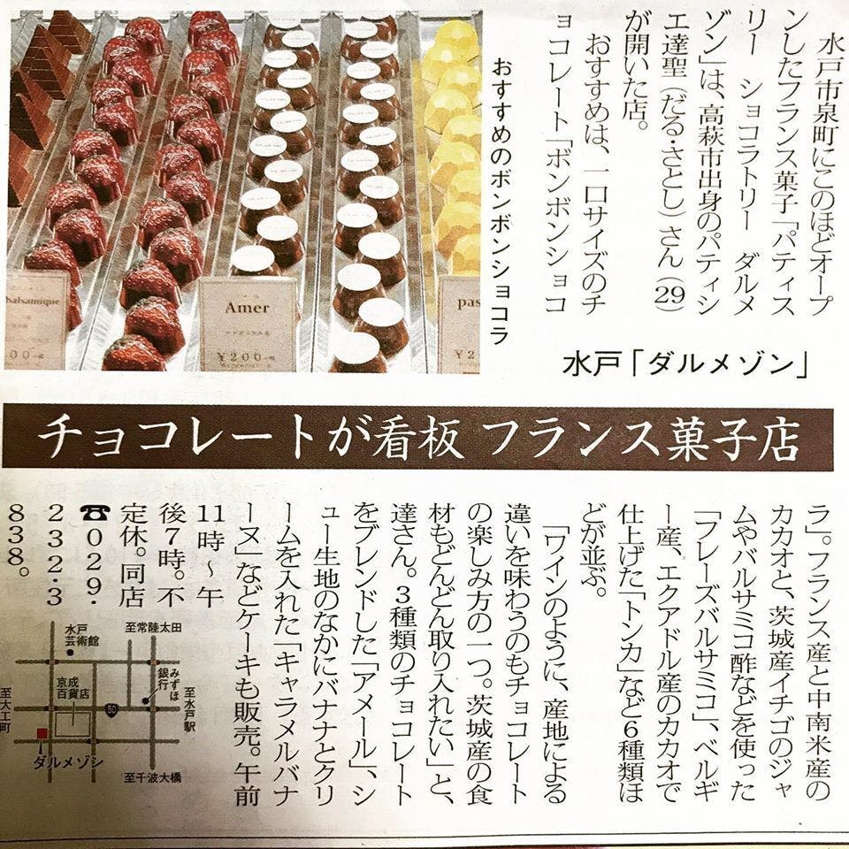 2019/12/01 02:02先日、よみうりタウンニュースにダルメゾンの記事を掲載いただきました!当店オープン以来、様々なメディアの方から問い合わせや取材依頼をいただいており、大変ありがたく思うと同時に背筋の伸びる思いです。本日がプロジェクトの最終日となりますが、一人でも多くの方に茨城の魅力を届けるために、一生懸命美味しいチョコレート、デザートをつくって参りますので、皆さまのご支援の程よろしくお願い申し上げます。(こちらは水戸経済新聞に掲載いただいた記事です^ ^)▽活動報告リンク:▶茨城県産のいちごジャム&バルサミコのチョコレートをお召し上がりください♪▶高萩発のスーパーフード・花貫フルーツほおずきをご賞味ください。▶茨城三大銘茶の一つ、古内茶の玉露でつくったチョコレートはいかが♪▶茨城の魅力が詰まったボンボンショコラセットがおススメ♪ もっと見る