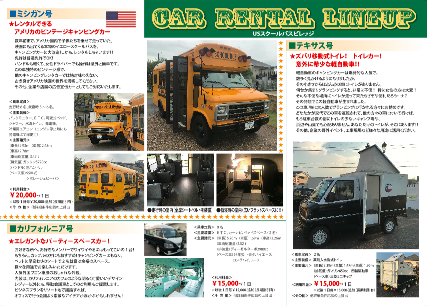 2019/11/30 16:31USスクールバスビレッジ、レンタカーのパンフレットが出来上がりました。ミシガン号は現在最終整備中で12月中旬くらいにはビレッジへやってくる予定です。その後本格的なキャンピングカーとして始動します! もっと見るレンタカーバス「ミシガン号」京都アメリカンフードフェスに出展