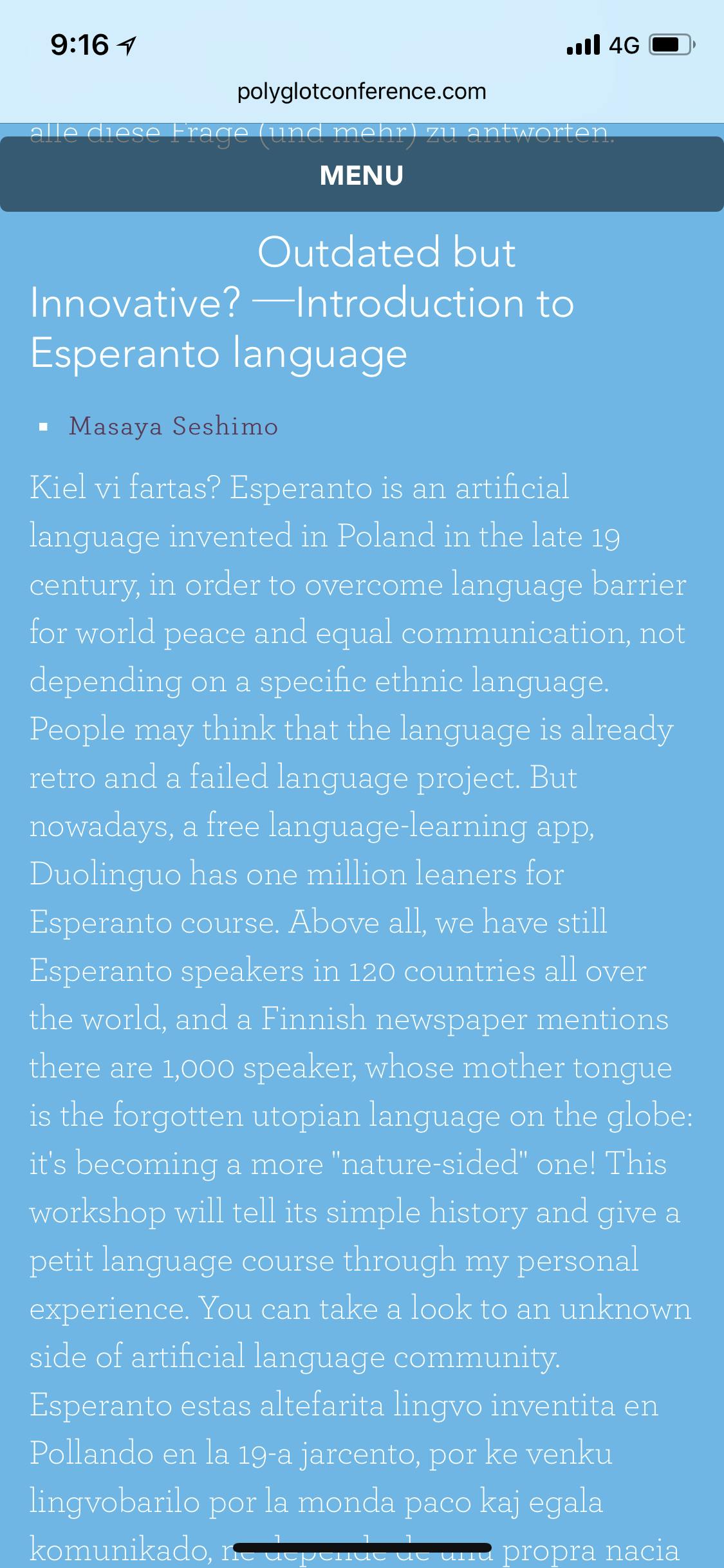 そのため、ポリグロット・コンフェレンスのようなより若い世代が集まり、学習意欲に溢れる方が来場されるイベントでエスペラント語の便利さ・面白さをワークショップを通じて周知したいと思います。ワークショップではエスペラント語の概要、歴史、体験談、エスペラント語の簡単な文法について講演致します。