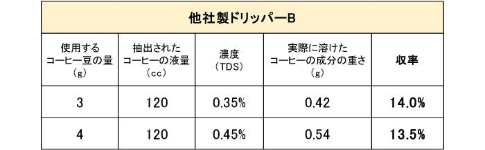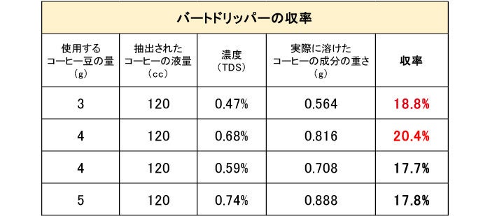 通常、10g前後のコーヒー粉量で1杯分ですが、実験はあえて少ないコーヒー粉量で行い、比較用に同条件で他社製のドリッパーも実験してみました。この実験結果では、バートドリッパーは少ないコーヒー粉量でも良いとされる範囲の値が出ました!
