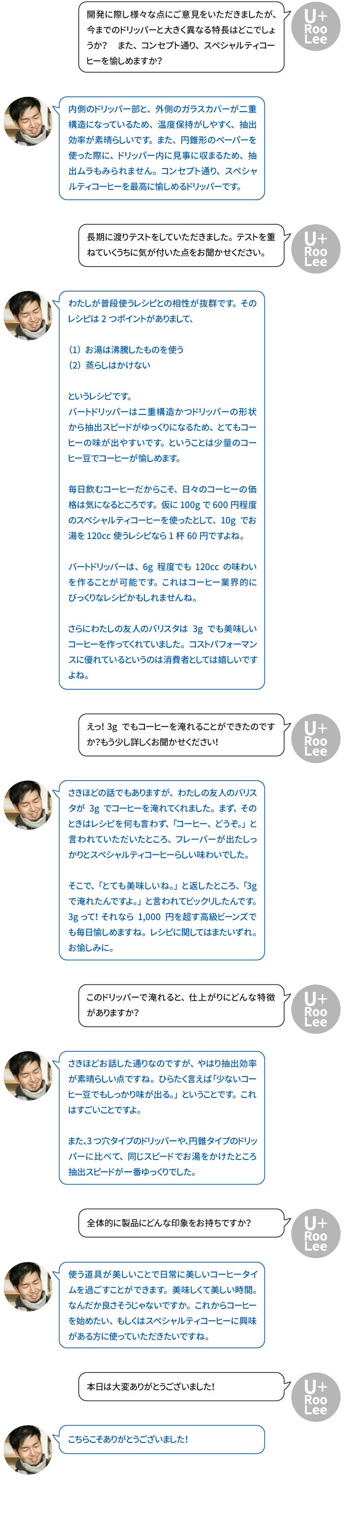 私たちの製品がそのきっかけになれたらと、U+RooLee はスタートしました。バートドリッパーはその思いをのせた株式会社シンドーのオリジナル製品です。この製品を通して、あなたやあなたの大切な人たちが笑い、語り合い、ゆっくりとした時間を過ごしてほしい。そう、目的は美味しいコーヒーがつくる素敵なひととき。それが私たちの思いです。バートドリッパーは、あなたの『ゆっくりとした愉しい時間を過ごすスイッチ』でありたいと思っています。