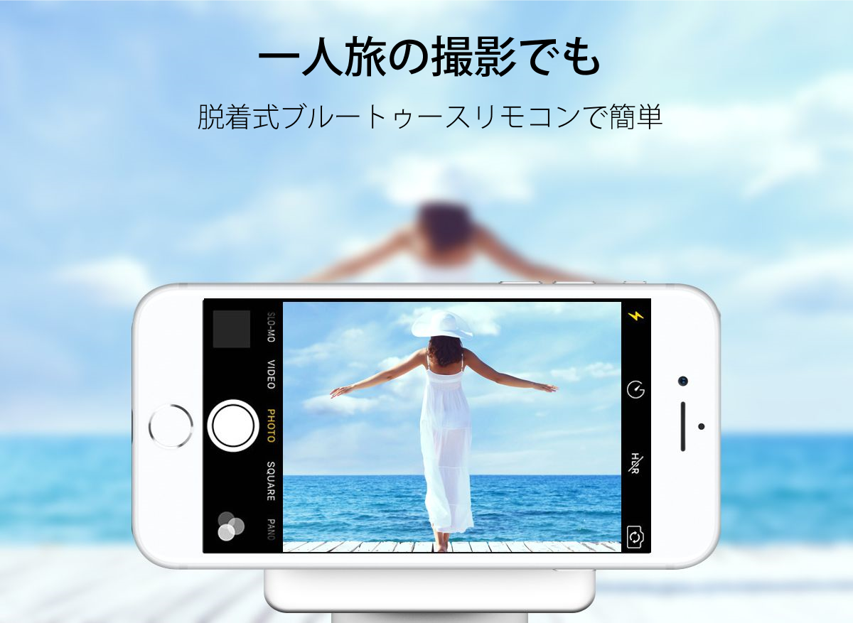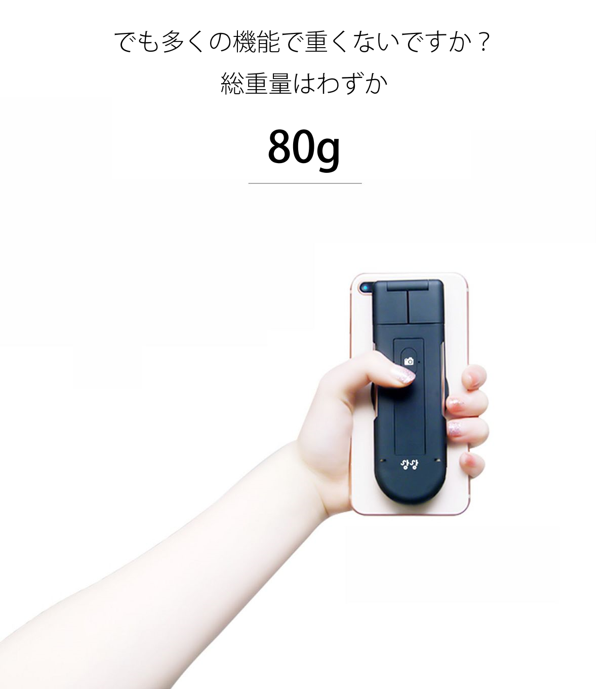 その軽さの中に、Bluetoothリモコンを内蔵し、自撮り棒・三脚・スタンド、様々な機能を完全に装備しました。
