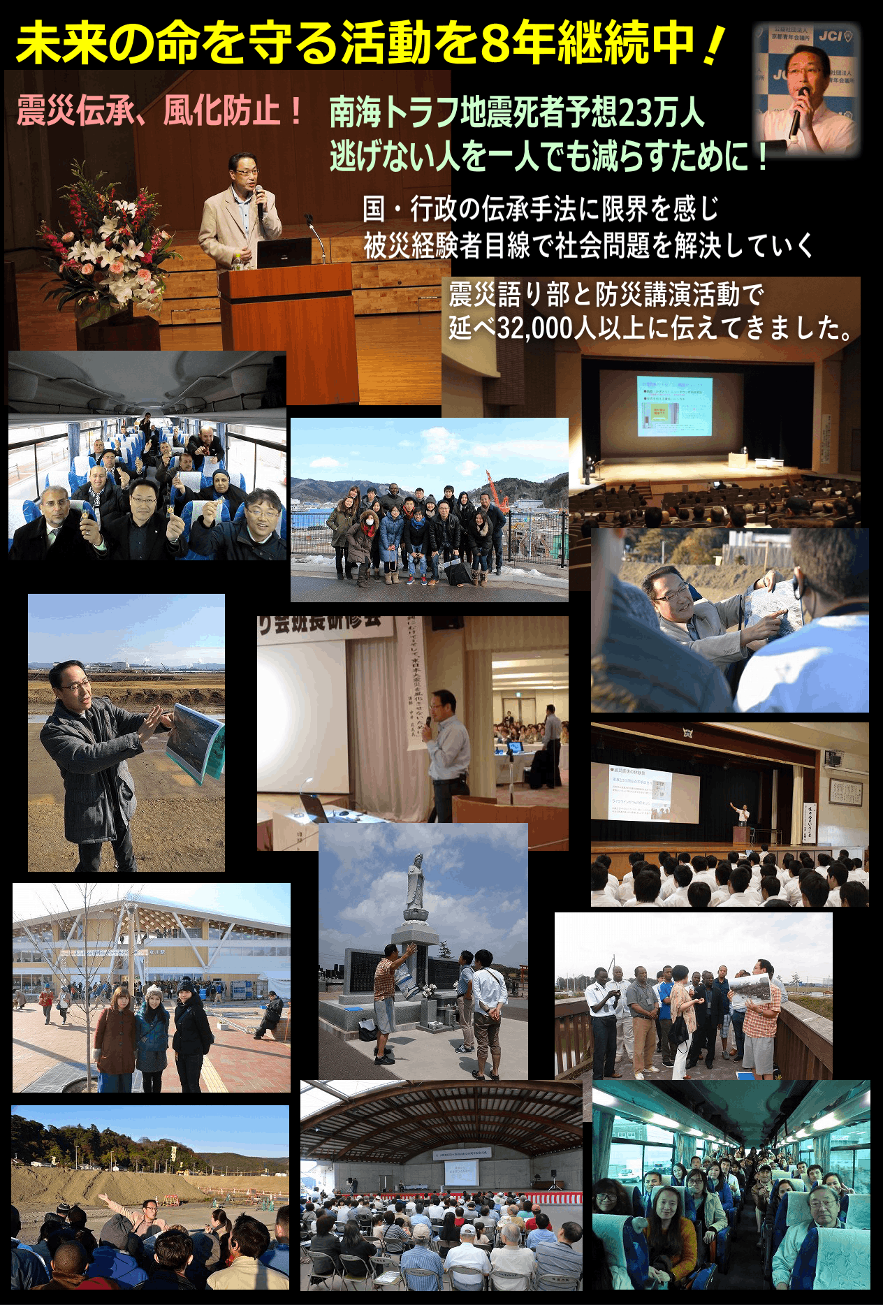 また、この大震災を風化させずに、後世の命を守るために「震災・津波の教訓」を後世に語り継がなければいけない!・・。と、2014年 一般社団法人防災プロジェクトを設立しました。