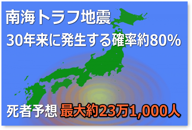 しかし・・30年来に約80%の確率で発生するとされる南海トラフ地震において、政府が発表している死者・行方不明者の予想は東日本大震災の約12倍以上に上る最大約23万1,000人です。