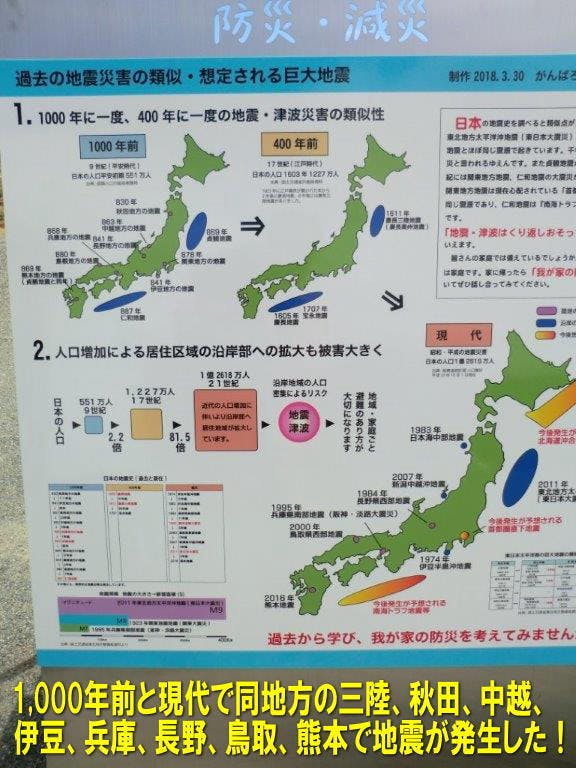 1,000年前は平安時代ですが、「三陸、秋田、中越、伊豆、兵庫、長野、鳥取、熊本」で地震が発生。現代も昭和から平成にかけて、「三陸、秋田、中越、伊豆、兵庫、長野、鳥取、熊本」全て「同地区」で地震が発生しています。