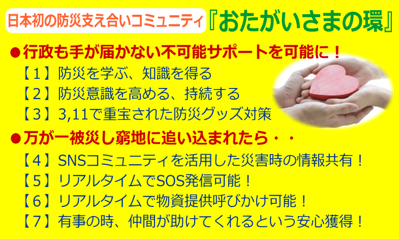報道でも伝えていない東日本大震災の真実(ソフト面)を伝え、低迷する防災備蓄率(ハード面)の底上げを図り、防災に関してあらゆる不安が解消できる「日本初の防災支え合いコミュニティ」を開設します!