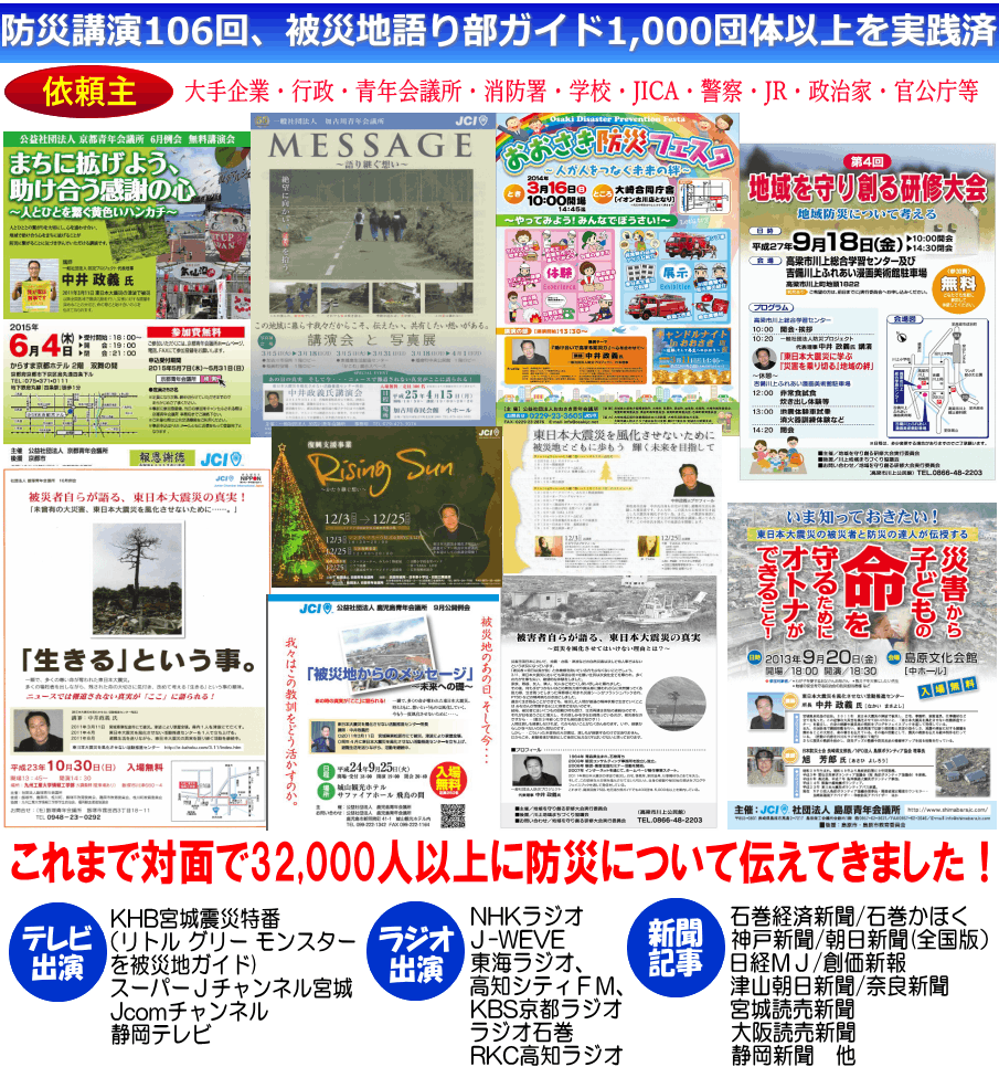 このように全国にて、防災講演やマスコミを通して被災後8年間、震災の真実を伝えています。