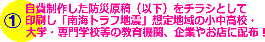 そこでオリジナル制作した原稿(以下)をチラシ(A4版)にして、皆さまのご支援の費用で印刷し、東南海地方の小中高校・大学・専門学校などの教育機関、企業やお店に広域配布します。