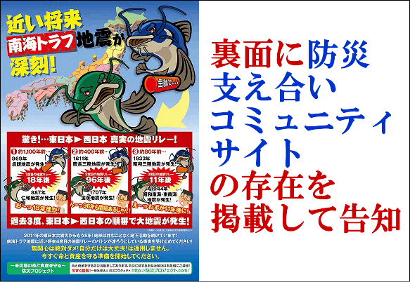 皆さまのご支援の費用で、前述のオリジナル制作チラシ(A4版)裏面に「防災支え合いコミュニティサイト 」の存在を掲載してメンバー募集告知を行います。