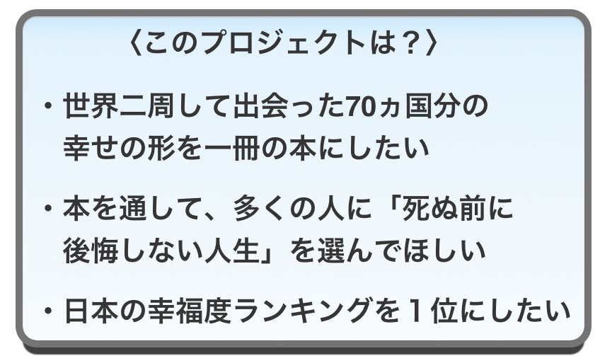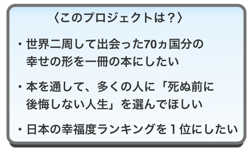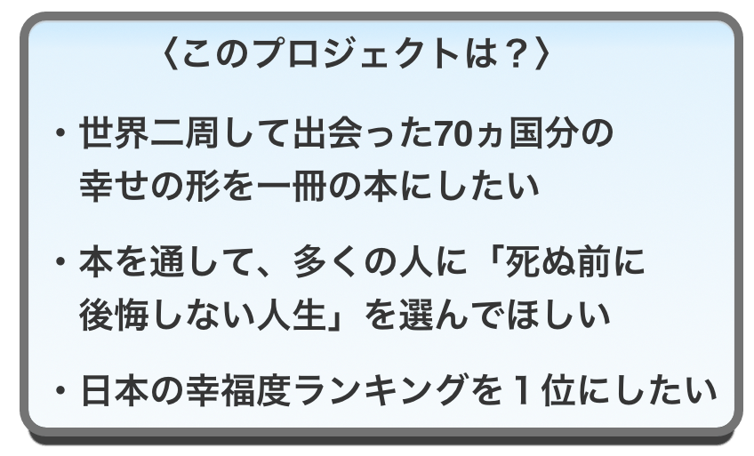 だからこそ、70か国、合計すると2年7ヶ月世界を巡って知り得たことのすべてをこの本に込めたい。そして、すこしでも多くの人にとって、「自分の幸せって本当は何なのか」考えるきっかけになればと願っています。