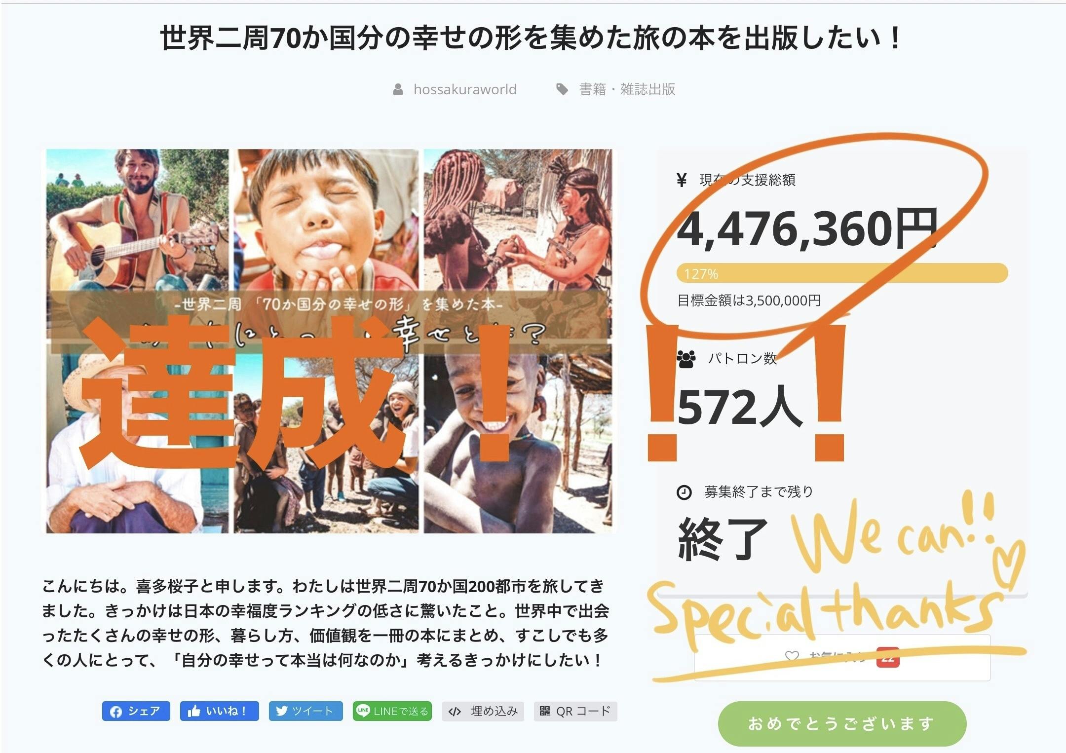 2019/12/05 20:36総支援者数:572人総支援金額:447万6360円みなさまのおかげで無事に、このプロジェクト大幅達成することができました。本当に本当に、ありがとうございました!!!!!何者でもないわたしが、こんなにも多くの方に応援していただけたことは本当に皆様のおかげでしかありません。正直、今回の挑戦は私の人生においてもかなり大きな挑戦でした。もちろん、何がなんでも達成させるという気持ちで臨んではいましたが、「本当に達成できるのだろうか?」というプレッシャーの方が大きかったのもまた事実です。これまでも、世界一周をはじめ、いろんな挑戦をしてきましたが、ここまで人を巻き込む挑戦は初めてで、はじめはなんだか自分の夢にみんなを巻き込んでいるみたいで申し訳ない気持ちになっていたりもしました。でも、少しずつ応援してくれる人が増え、このプロジェクトが自分だけの夢ではなくなりました。愛情をたっぷり注いでもらいながら壮大なプロジェクトに生き物みたいに成長していくのをリアルに感じました。それはそれはドラマチックで、みんながテラスハウスよりもバチェラーよりも、老若男女なメンバーがこのドラマを楽しんでくれていたことがとても嬉しかったです。笑また一つ、自分が体験したからこそ、自信を持ってみんなにお伝えできるエピソードができました。「やってみなくちゃ、わからない。プレッシャーの向こう側には愛がある」今回、これまでにない挑戦をしたおかげで、溺れそうになるほどに、多くの方の愛を感じることができました。このプロジェクト自体が本当にシェアハピな空間でした。本を通して、一人でも多くの人とハッピーをシェアしたい。そう思ってこのプロジェクトをスタートさせましたが、最高の見切り発車となりました。ハッピーは連鎖するという状況を、この目で肌で実感することができました。きっと、このプロジェクトを気にかけてくれていた全ての方が、少なからずそんな空気を感じてくれたのでは?と思います。このあらすじだけで、一冊の本ができてしまいそうですが、まだまだ序章で、ここからが本番です。みんなの想いを100倍返しでお届けしていけるよう、最強のメンバーで、妥協なく本気の本作りをしていきたいと思います。本のお届けはまだまだ先になってしまいますが、どうぞ皆さま、楽しみに待っていて頂けたら幸いです。最後に、最高のシェアハピをありがとうございました!!!!We can!!!喜多桜子 もっと見る