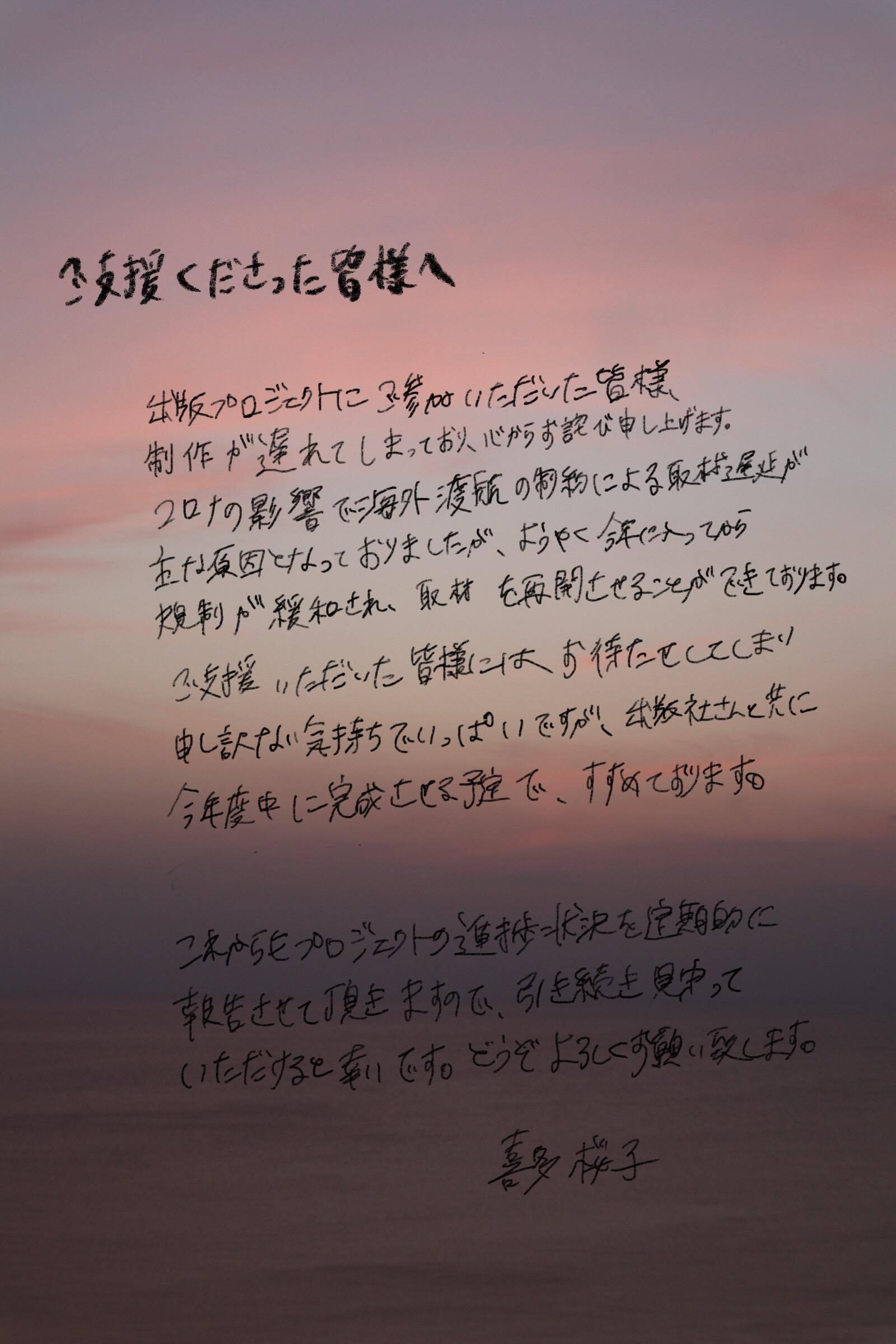 2023/08/01 10:20ご支援くださったみなさまへ書籍制作プロジェクトのクラウドファンディングへのご参加、本当にありがとうございます。以前の報告でお知らせした通り、制作が予定より遅れてしまったことを心からお詫び申し上げます。この遅れは、海外渡航の制約による取材の遅延が主な原因となっております。ただ、幸いなことに今年に入って規制が緩和され海外渡航が叶い、ようやく取材を本格的に再開することができております。本当にちゃんと実行されるのだろうか?と不安にさせてしまっていた方もいらっしゃると思います。わたし自身も正直、いつ収束するのか予測できない状況や度重なる延期のご連絡に、後ろめたさもありました。そんな中、「完成楽しみにしています」というメッセージなどをいただくことも多く、本当に救われる気持ちでした。ご支援いただいたみなさまにはお待たせしてしまい、誠に申し訳ありません。ただ、新たなエピソードも加わり今年度中に完成させる予定で着々と進めております。完成までの道のりが長く感じられるかもしれませんが、みなさまの温かい理解とご支援が何よりも励みになっております。これからも、プロジェクトの進捗状況を定期的に報告させていただきます。引き続き、私たちの書籍制作プロジェクトを温かく見守っていただけましたら幸いです。どうぞよろしくお願い致します。喜多桜子 もっと見る明けましておめでとうございます!