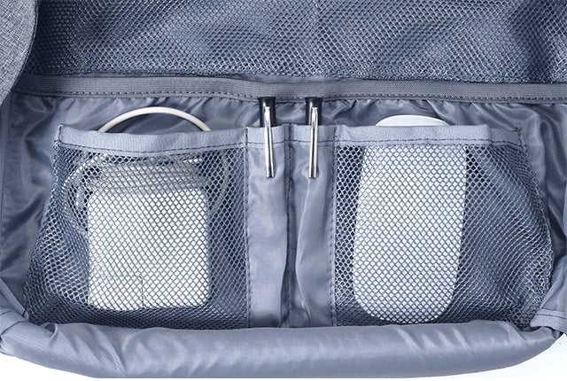 最上部のポケットの中から充電用のUSB端子を取り出すことができ、充電中のモバイルはそのポケットの中に入れておくことができます。