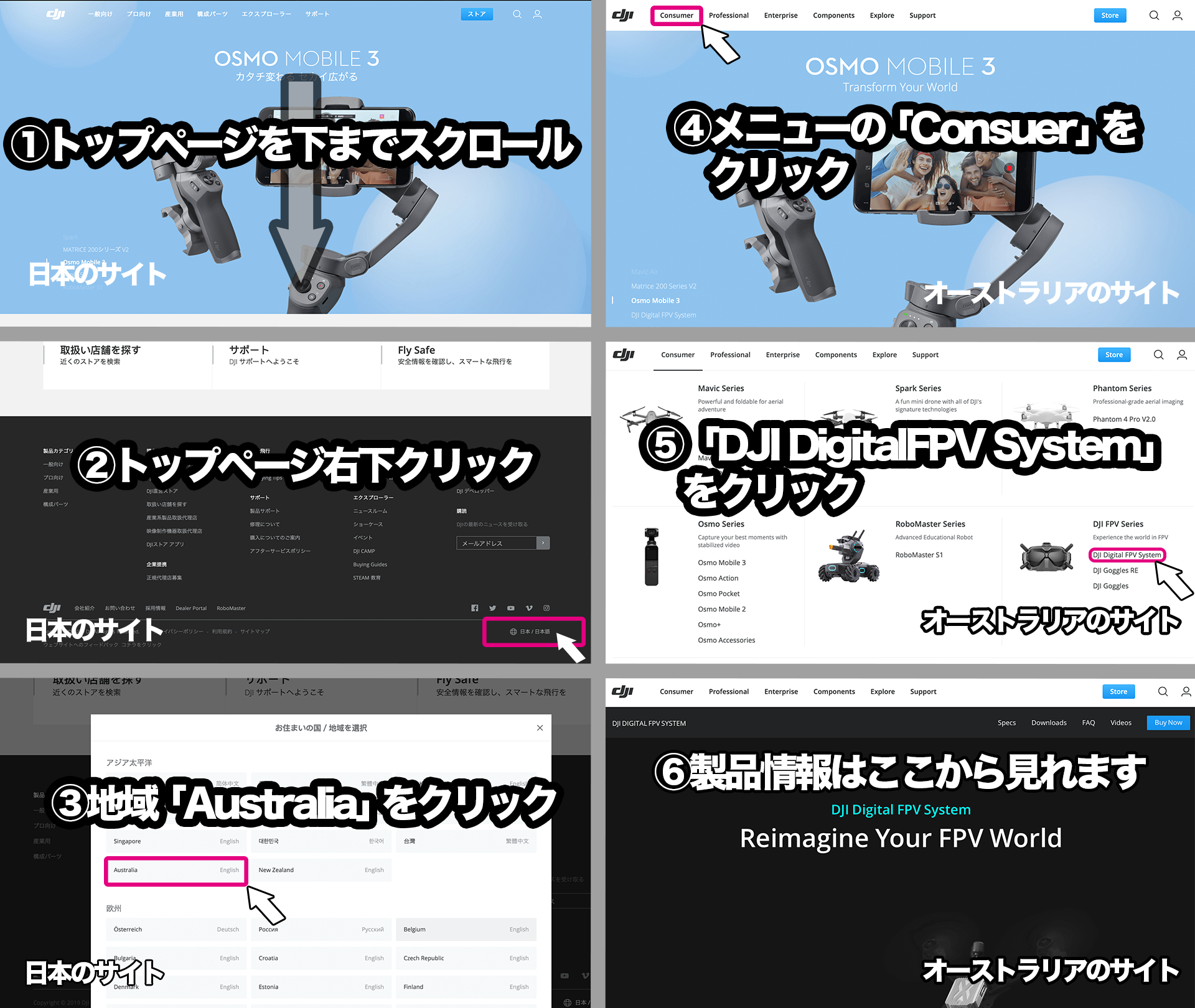 補足:Digital FPV Systemの詳細をご覧になりたい方はDJIサイトを開き、言語をオーストラリアなど商品が発売される地域に変更してください。(言語の変更は、ホームページの一番下の右側にあります。)