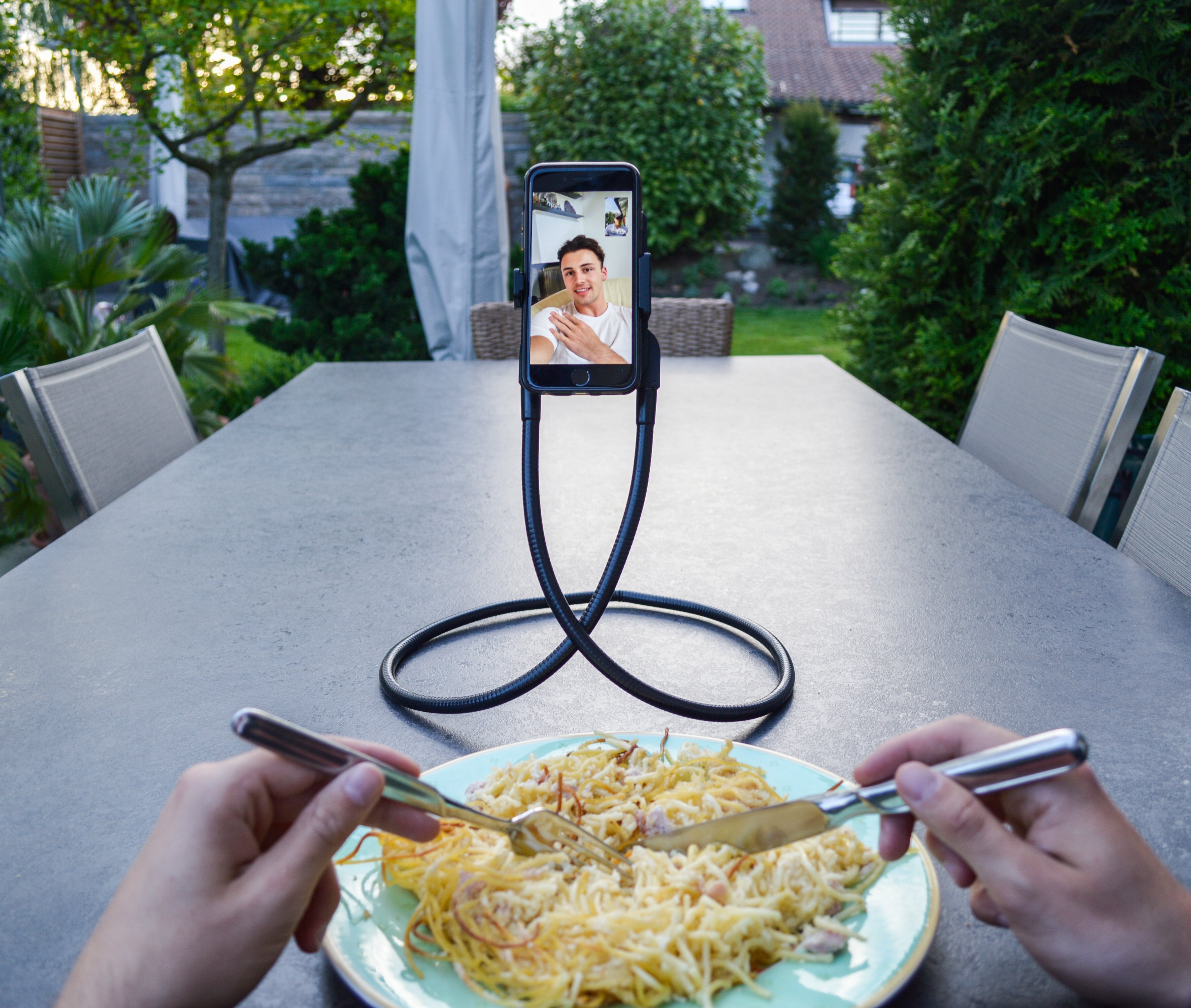 FLEXD-SMARTを机においてスマホを固定すれば、相手と会話しながら食事を楽しめます。