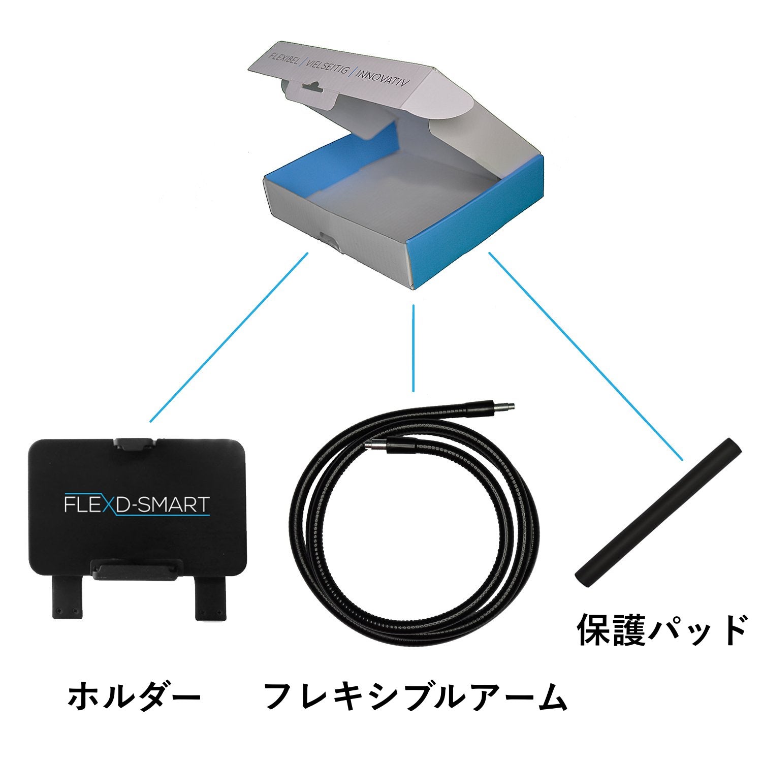 ホルダー、フレキシブルアーム、保護パッドが入っています。