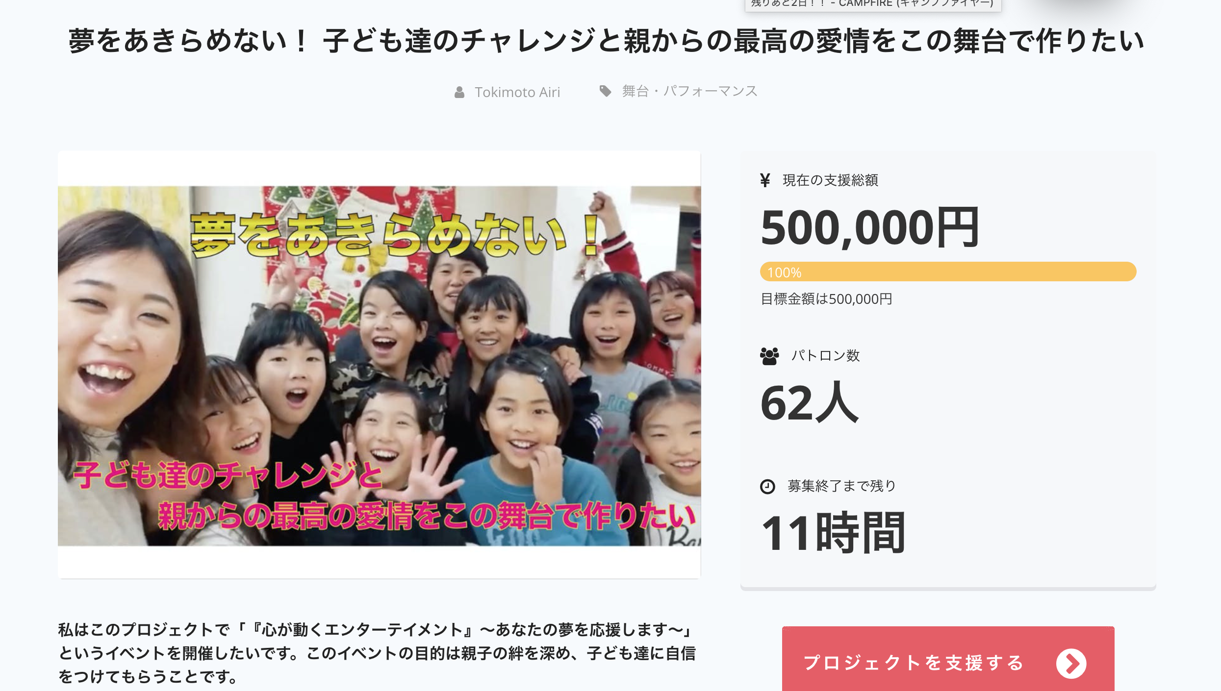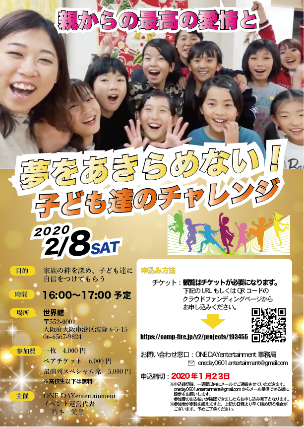 2020/01/22 23:28昨日誕生日を迎えました!!仕事場でケーキを頂き泣きそうになるぐらい嬉しかったです‼︎一緒に写ってくださっているのはイベント当日カメラマンをしてくれる荒木美穂さんです‼︎仲間がいるって本当に心強い!!そして、【あと2日間】でクラウドファンディングが終了します! 残り3,9000円で達成です!!いつも応援、声援、ご支援いただきありがとうございます! 私はテーマパークでダンサーをしている時に見た、たくさんの幸せな家族から家族の愛って素敵だなと思っていました! ダンサーを辞め新しいことを始めたいと思って動いていた後の自分の挫折体験で自信を失っていた時にこうやって夢を諦めていく人って多いのかなと思いました。 自分に自信がない原因って何なんだろう?そう考えました。 辿り着いたのは、子どもの時に受けた親からの愛情が関係しているという事です。 私は両親からあまり言葉で褒めてもらった経験がなくどこか寂しさをもっていたのかもしれません。 私はただダンスイベントを開催したい訳ではありません。 このイベントに参加する事で一人でも多くの子ども達が自分に自信を持ち、夢を持った時にどんな困難があっても愛情をいっぱい受けた強い心で諦めないで欲しい‼︎ そしてお父さん、お母さんも普段出来ない愛情表現をし、キラキラしている子どもと一緒に楽しんでほしい‼ それが私がテーマパークで見てきた世界です^^ これを一人でも多くの人に知ってもらう為に、クラウドファンディングという形でチャレンジさせて頂きました。 ご支援頂きましたお金は、子ども達のために会場や衣装、メイク用品代、今後も続く活動費として、大切に使わせていただきます。 この活動をきっかけに家庭問題があるご家族や障害を持った子ども達も参加できるように続けていきたいと思っています! 私は沢山の経験から人に感動を伝える「感動伝道師」として活動する役目を頂きました。 愛は感動を生み、感動は幸せを生みます。それを伝えるのが「私の使命」だと感じています。 すでにたくさんの方から温かいご支援をいただいております。心から感謝いたします。ありがとうございます。 12/5から開始したクラウドファンディング期間もあと2日です・・。みなさまのお力を貸していただけませんでしょうか。 当日もたくさんの方に見にきて頂きたいです。最後まで応援よろしくお願い致します。 時本愛里 もっと見る