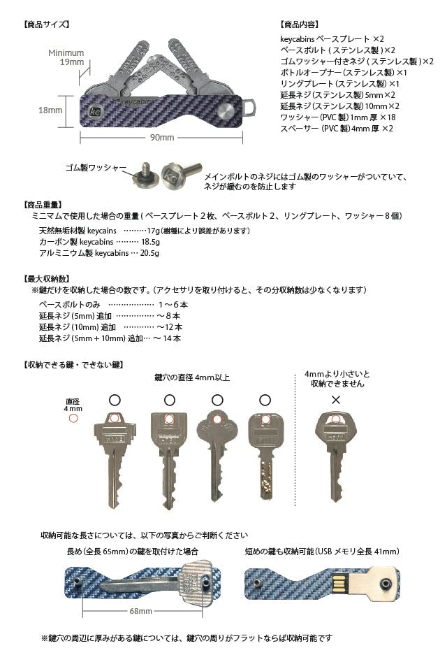 A.一般的な形状の鍵でしたら、ミニマムな状態で1~6本(アクセサリを含まない数)まで収納できます。付属の延長ネジで拡張することで、サイズは4段階。6本、8本、12本、14本のサイズになります。※リングプレートやUSBメモリを収納すると、その分収納できる鍵の本数は減ります。
