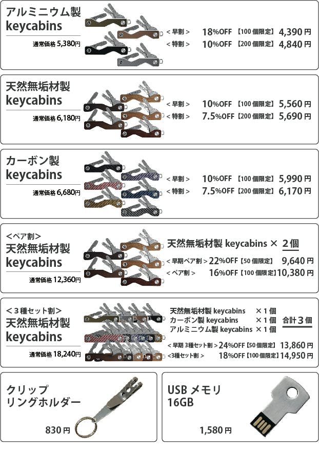 A.USBメモリ、クリップリングホルダーは別売りです。各リターンからご支援ください。ボトルオープナーとリングプレートは標準で付属しています。