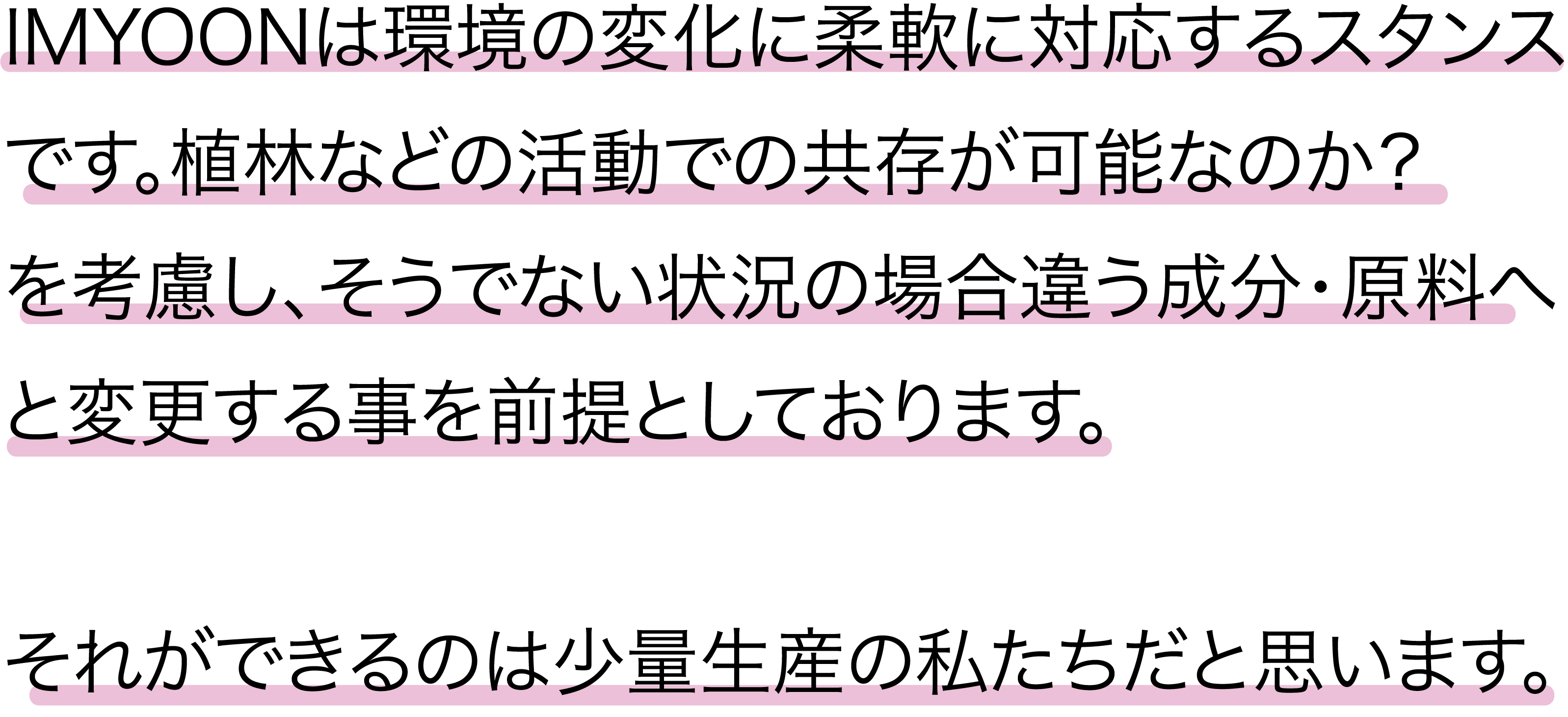 また、特に「環境を配慮できているのか?」をクリアできなけれなばIMYOON(イ・ミューン)がコスメ業界に参入する意味はない!と思ったからです。