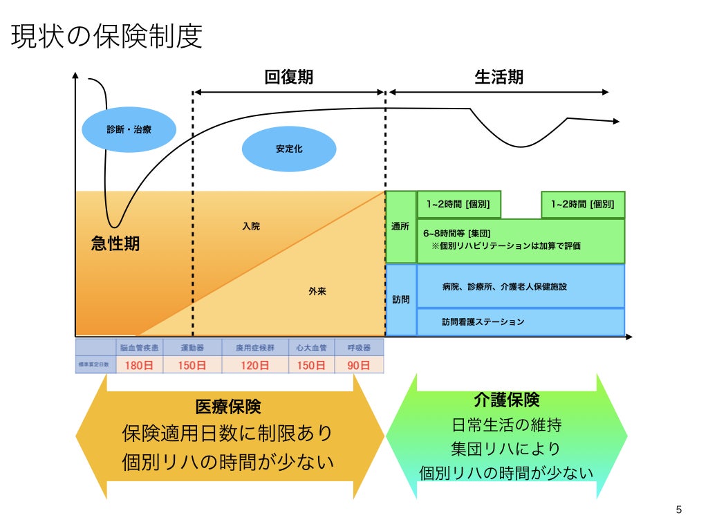 現在の医療・介護保険制度では治療の時間・期限に制限があります。医療現場から施設に行くと、介護のケアは充実していますが「リハビリの時間が少ない、もっとリハビリを受けたい」と言った声が多く聞かれます。