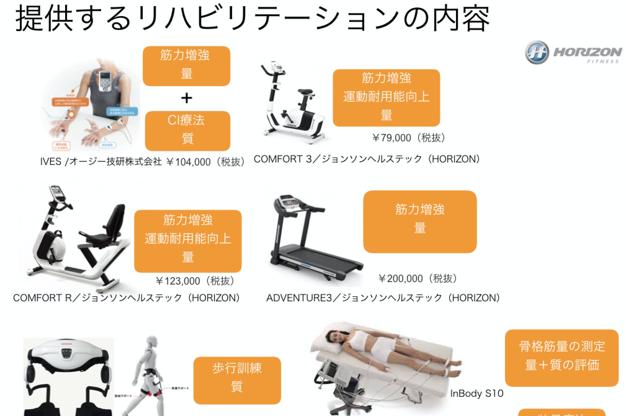 購入:ルームランナー、自転車エルゴメーター、電動昇降ベット 2 台、平行棒