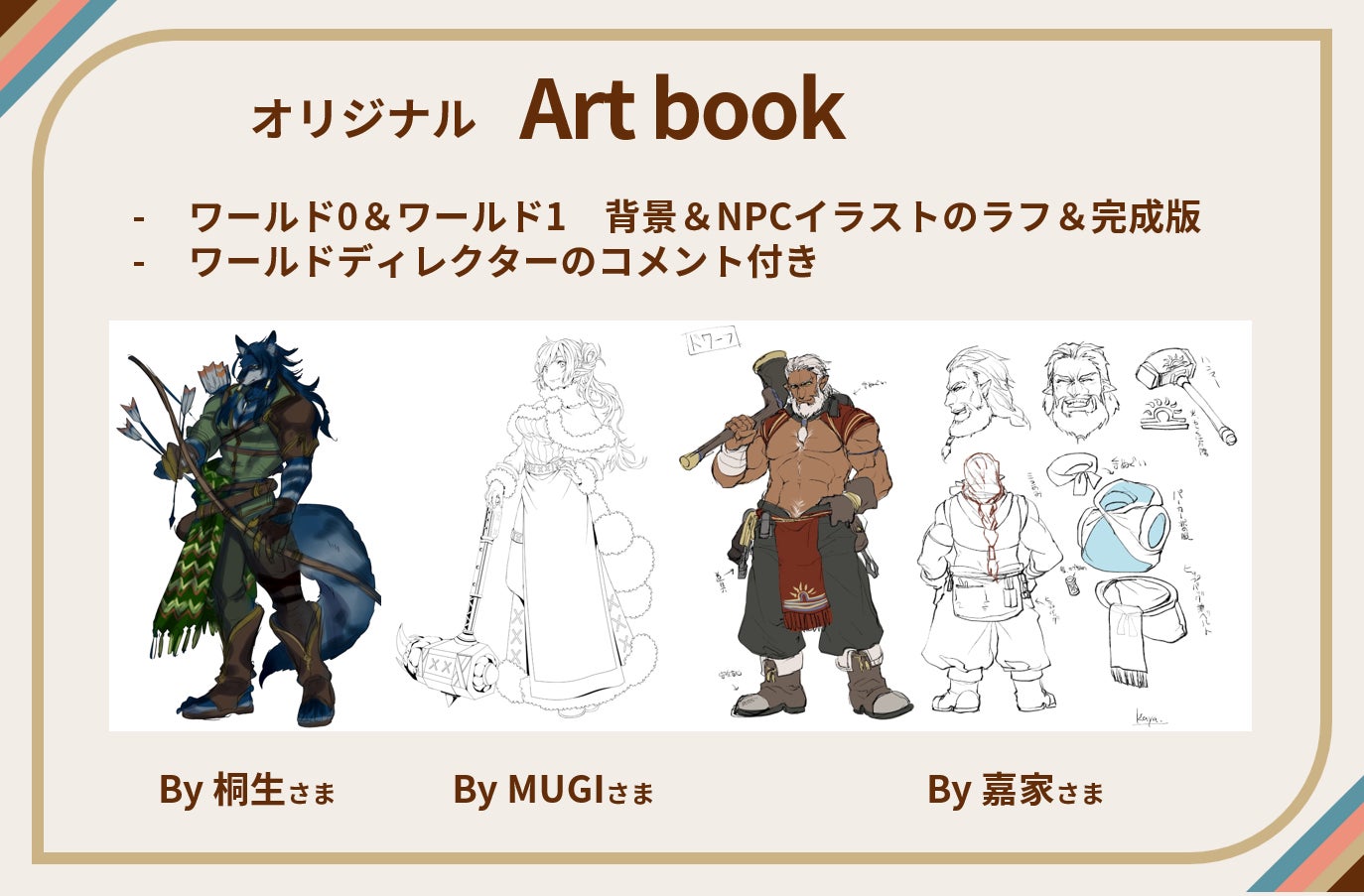 剣と魔法のファンタジー"ワールド0”および、都市型現代伝奇"ワールド1"に参加いただいているイラストレーターが描いた、キャラクターや背景イラストの【初期デザインラフ画】と【完成品】を収録したアートブックです。
