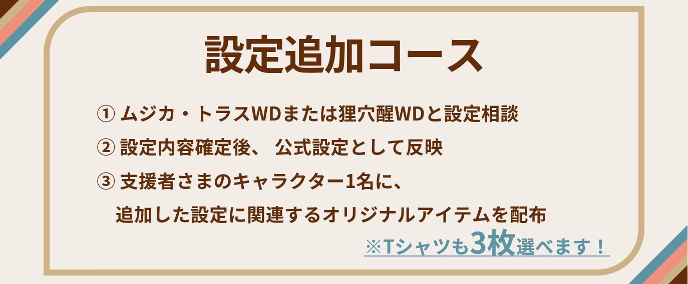 CF限定で、ムジカ・トラスWDが担当する「ワールド0:ハイファンタジー」または狸穴醒WDが担当する「ワールド1:都市型現代伝奇」において、支援者さまと調整のうえ、ダンジョンや土地、組織や魔物や事件など、設定の追加を行います。