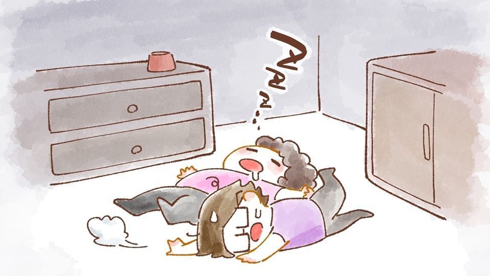 そのうち、ようやくリビングの床の上に、二人で倒れるように寝ています。