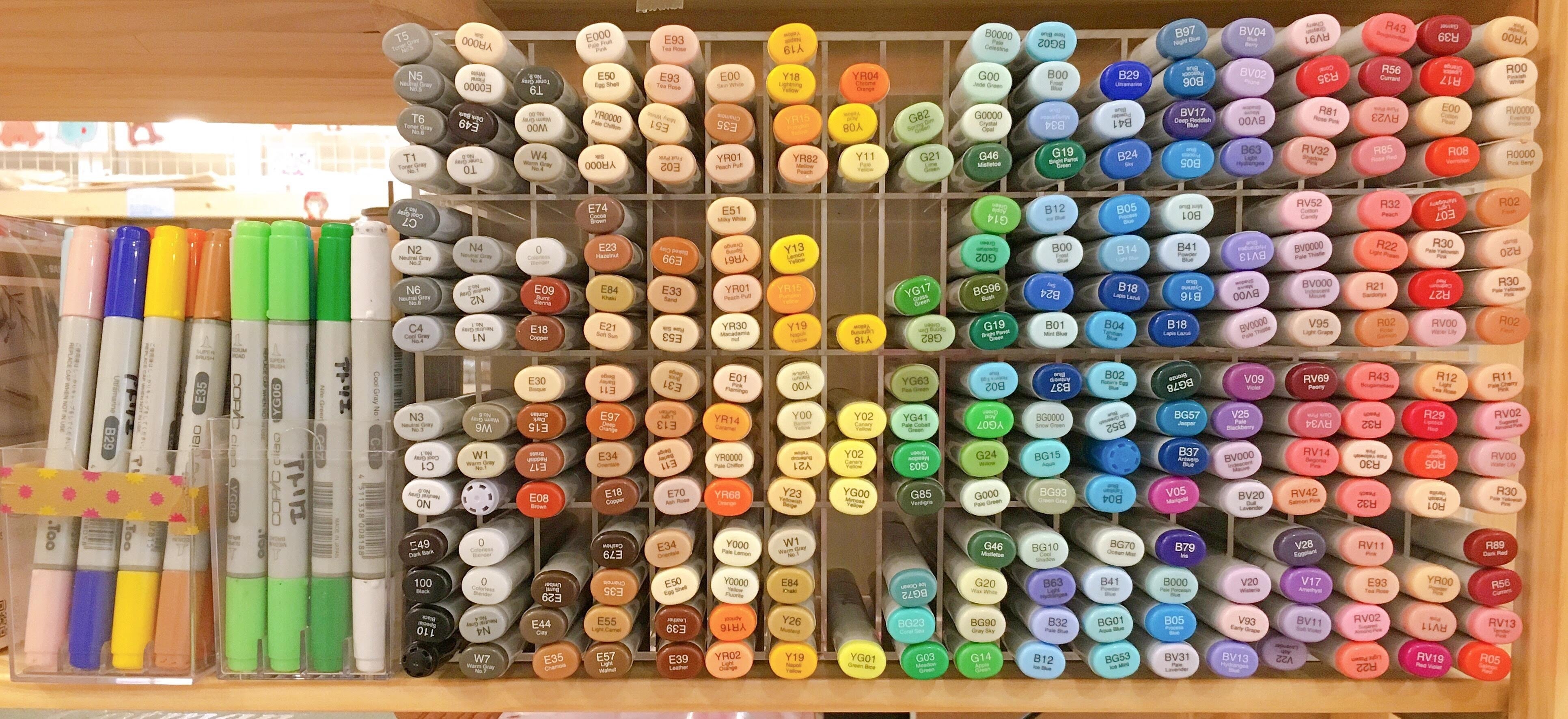 店内では設置してある沢山の画材が無料で利用できます。無料の紙もあるので、手ぶらで来ていただいてもお絵描きできます。