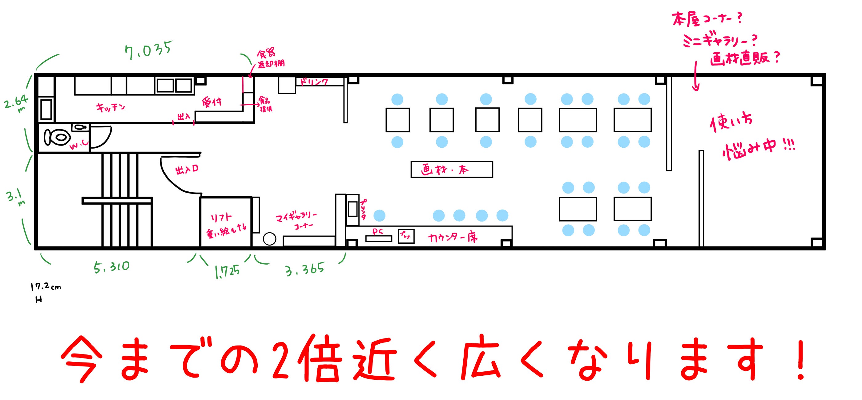 こちらの物件は現店舗の2倍近くの広さがありますので、客席は現在の20席から30席へ席数を増やそうと思っています!ただ、単純に席を倍にしてしまうとお料理の提供が追いつかなくなってしまう可能性がありますので、スペースの4分の1は画材や本などの物販またはミニギャラリー貸出等を行おうかと考えています。