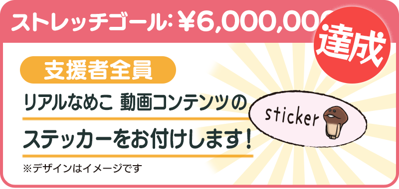 【達成しました!】ご支援いただいた方全員に、身軽になったリアルなめこさんがこれから投稿するであろう「動画コンテンツ」をモチーフにしたステッカーをお付けします。1プランにつきステッカー1枚がリターンに追加されます。